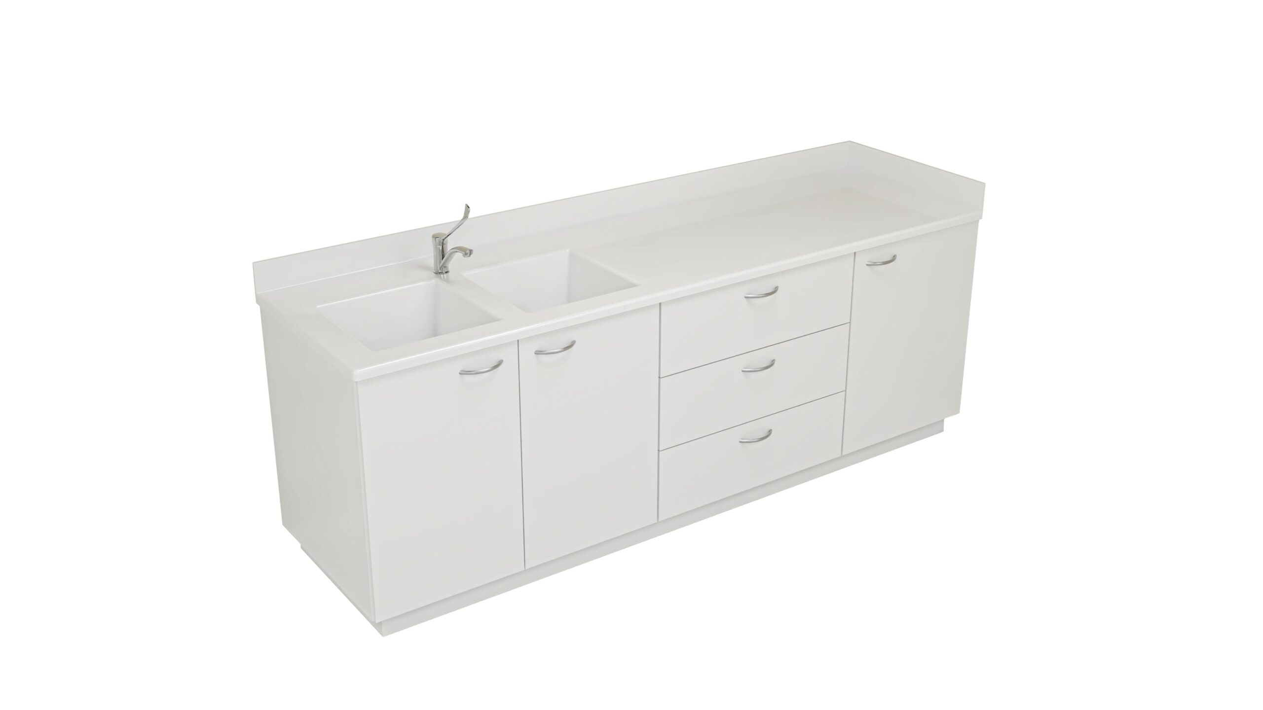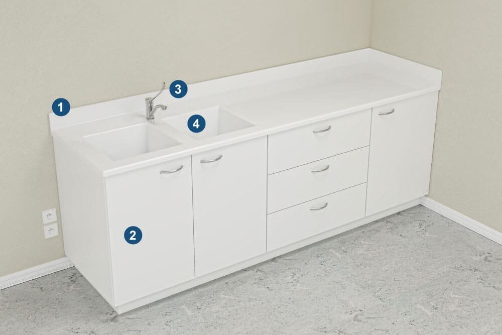 Un support complémentaire en aggloméré hydrofuge mélaminé blanc ou en PVC expansé est intégré afin d’assurer une assise parfaite de la paillasse sur les meubles porteurs.