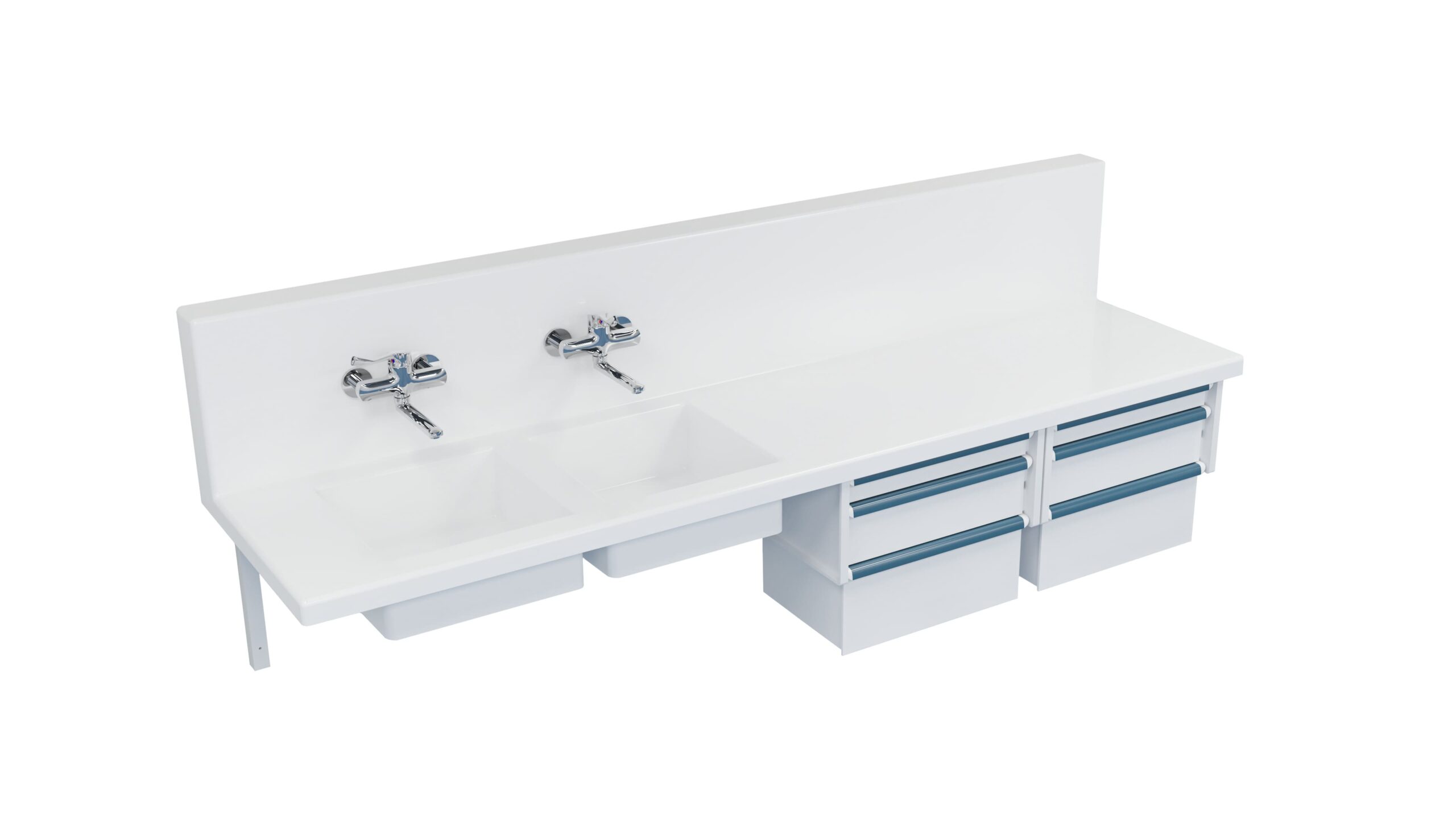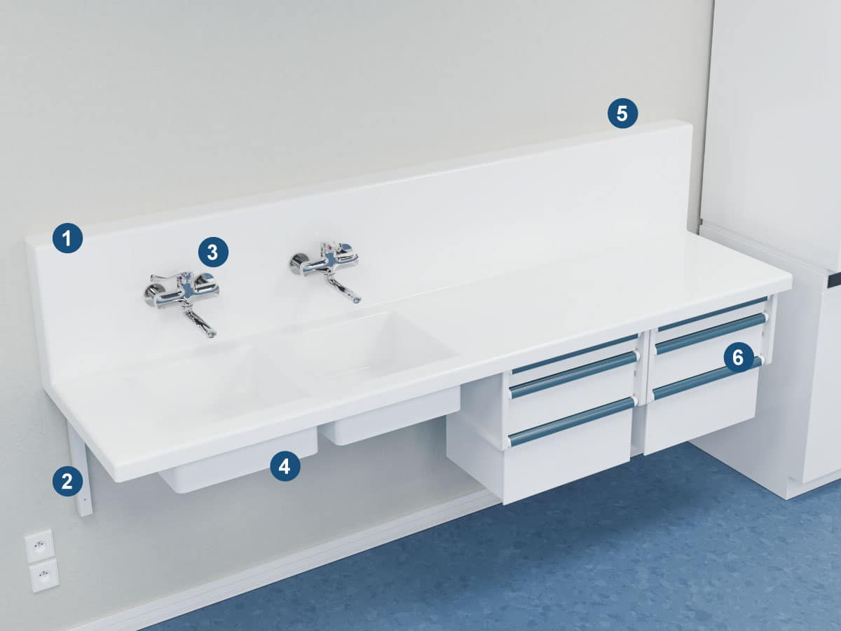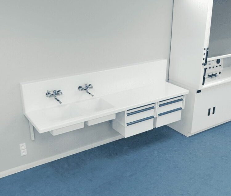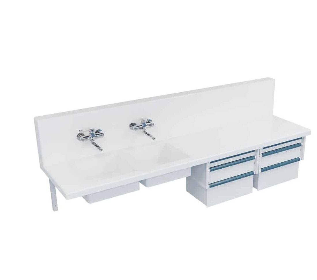 Conçu en résine minérale 100 % acrylique, la paillasse offre une excellente résistance aux produits chimiques et à l’humidité, tout en garantissant une facilité d’entretien et un confort de travail pour les équipes médicales.