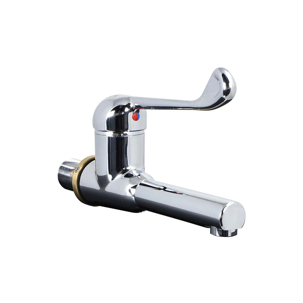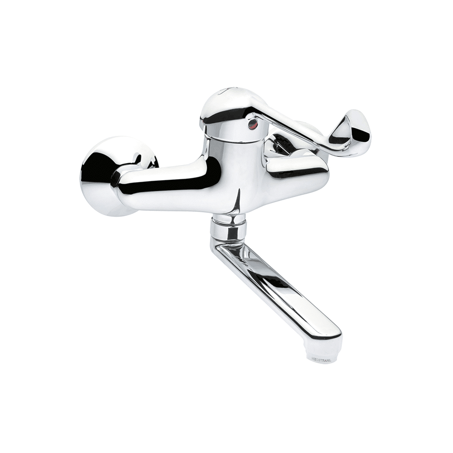 Mitigeur mural à bec court avec levier hygiène.