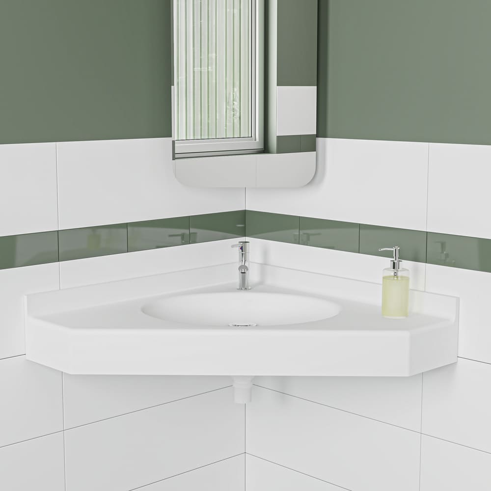 Le plan-vasque DIAMANT est un modèle autoportant au design angulaire, conçu pour une implantation en angle, idéale dans les espaces restreints ou les configurations spécifiques. Fabriqué en SolidSurface pleine masse, il associe résistance, hygiène et douceur au toucher. Sa cuve ovale, soudée et parfaitement intégrée, assure un rendu homogène et sans joints visibles. Conforme aux normes PMR, le plan-vasque DIAMANT allie accessibilité, facilité d’entretien et esthétique contemporaine. Il est disponible en blanc ou dans le coloris de votre choix et personnalisable avec des options.