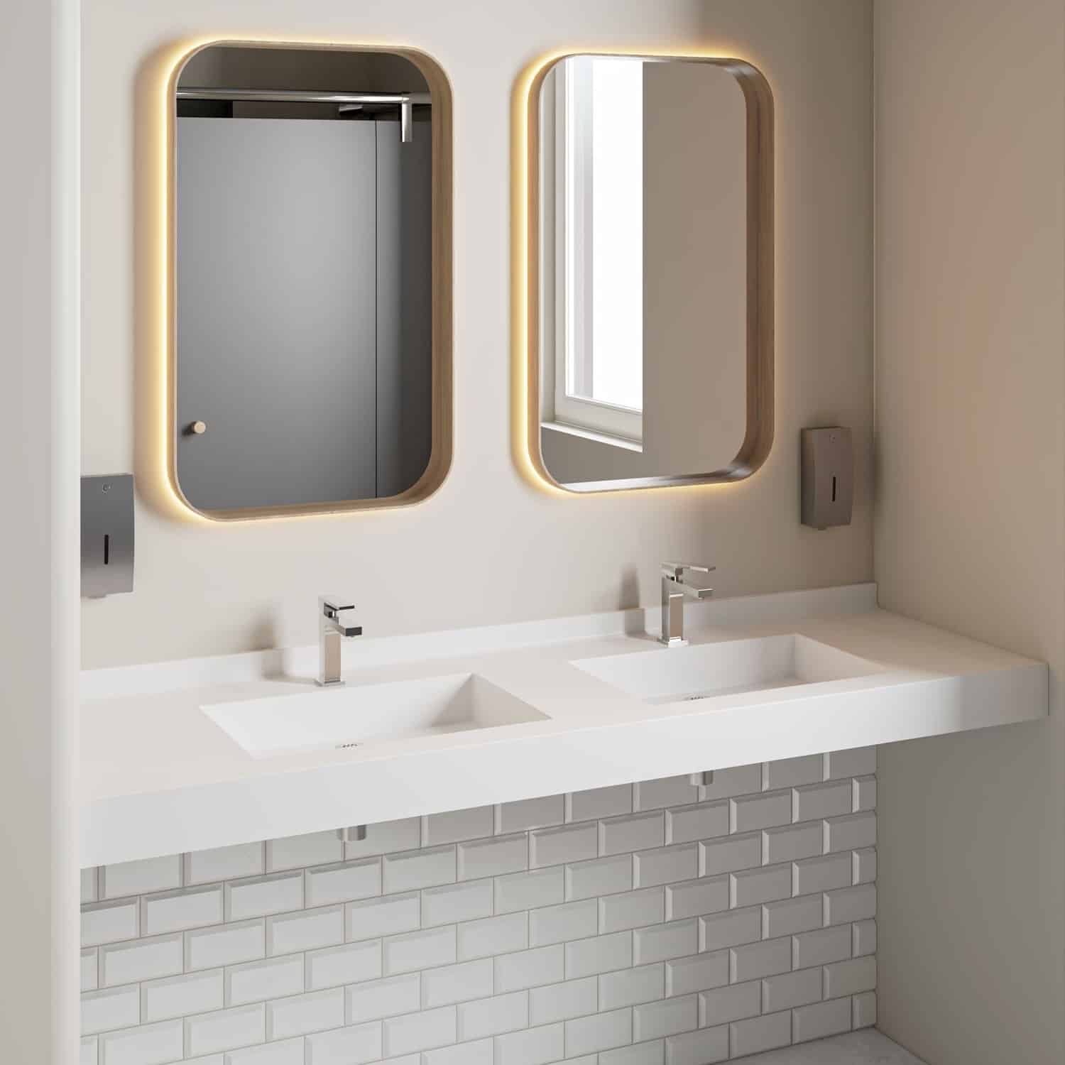 Plan-vasque PMR à poste multiple, extension du modèle JASPE simple. Design et ergonomique avec ses ligne plus strictes le modèle JASPE+ est parfaitement adapté aux espace sanitaire recevant du public.