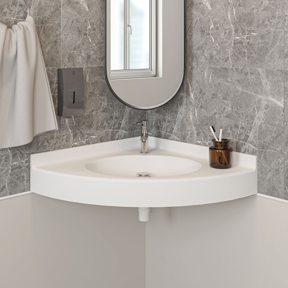 Le plan-vasque PYRITE est un modèle autoportant au design angulaire, conçu pour une implantation en angle, idéale dans les espaces restreints ou les configurations spécifiques. Fabriqué en SolidSurface pleine masse, il associe résistance, hygiène et douceur au toucher. Sa cuve ovale, soudée et parfaitement intégrée, assure un rendu homogène et sans joints visibles. Conforme aux normes PMR, le plan-vasque PYRITE allie accessibilité, facilité d’entretien et esthétique contemporaine. Il est disponible en blanc ou dans le coloris de votre choix et personnalisable avec des options.